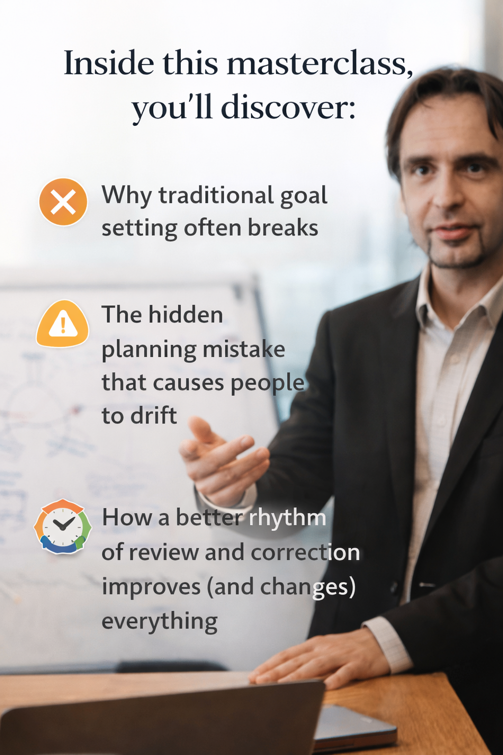 No. This masterclass is about execution, not motivational goal-setting. It focuses on feedback, review, and planning rhythms that hold up under real-life pressure.